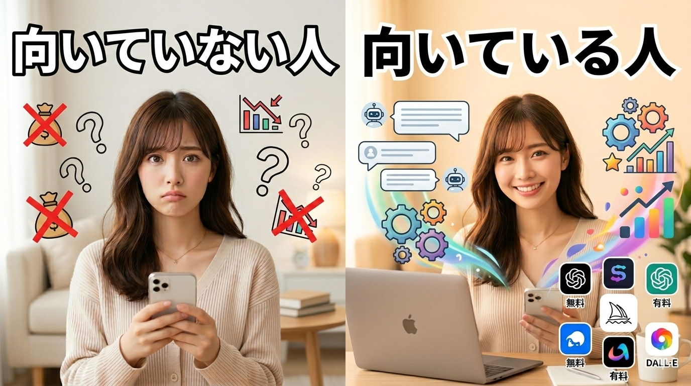 AI副業は初心者でも始めやすい一方で、全員に合うとは限りません。自分の性格や考え方によって、成果が出やすい人とそうでない人がいます。この記事では、AI副業に向いている人・向いていない人の特徴をわかりやすく解説します。