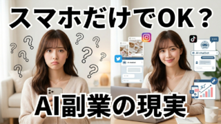 「AI副業ってスマホだけでできるの?」「パソコンがなくても稼げる?」最近は「スマホ副業」という言葉もよく見かけるようになり、AI副業もスマホだけで始められるのか気になっている人は多いです。この記事では、AI副業がスマホだけでできるのかという...